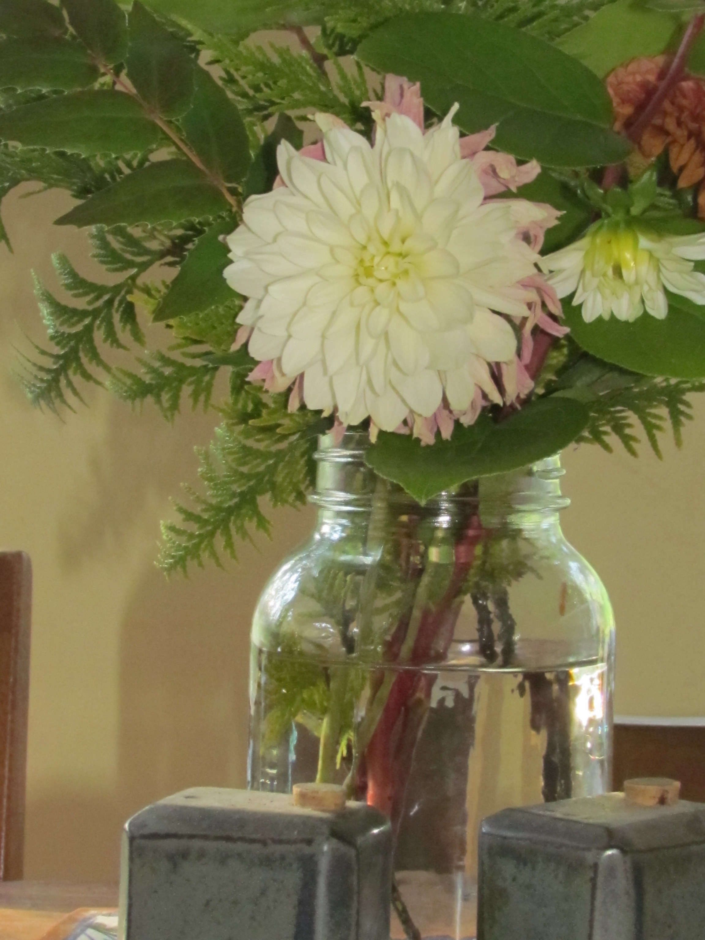 This bouquet presently sits on my kitchen table, and the morning light shining on the glass jar aroused my photographer’s eye. I am playing around with aperture and shutter speed settings on my SLR for another project, and am finding myself snapping shots of all sorts of random things around my house. This jar of foliage and blooms is a calm oasis in the busy-ness of my household, and I share it with you to perhaps bring a touch of simplicity to your day.